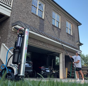 The result is pure water that is sent through an extended pole and applied with a delicate bristle brush. We scrub until the windows shine. That water sun dries without leaving spots, or streaks.